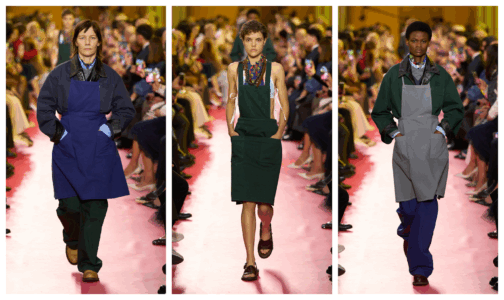 The aprons were in cotton material and some in leather, the cotton highlights the more comfortable material and the leather on the other hand is a more bold choice of material. Aprons are also a universal symbol of work, with functional purposes, which is what Miu Miu collection showcased.